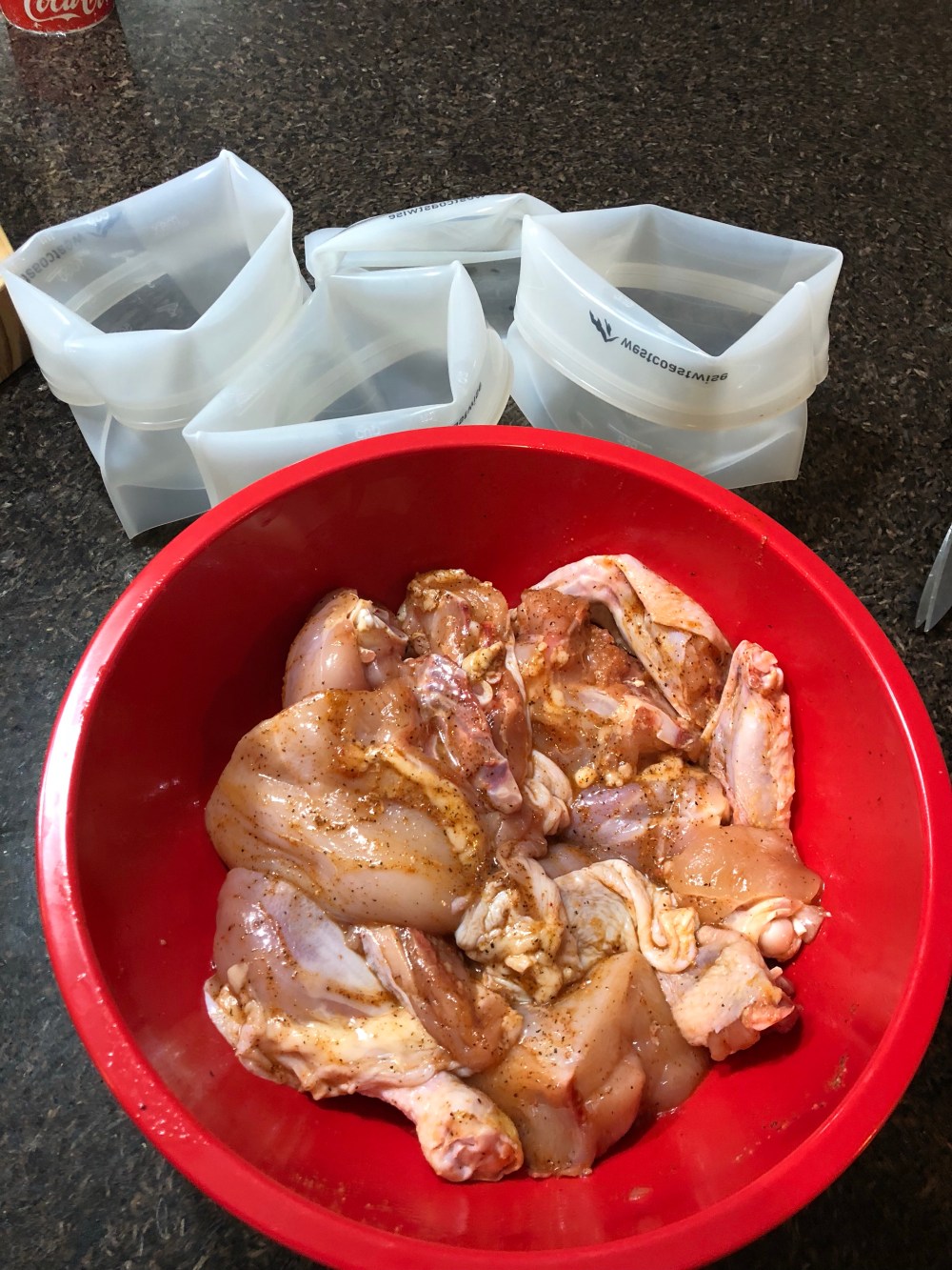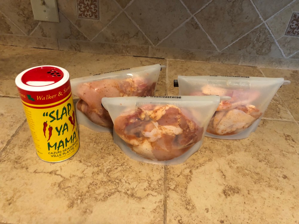 First, I break down a whole chicken into ten pieces. You’re probably wondering how I was able to get so many out of a chicken. Well, I cut the breast in half since it was so big. I then seasoned the pieces with Slap Ya Mama Cajun Seasoning. For the sous vide bags, I was able to find re-usable ones on Amazon. I placed the chicken in them and let it marinate over night.
