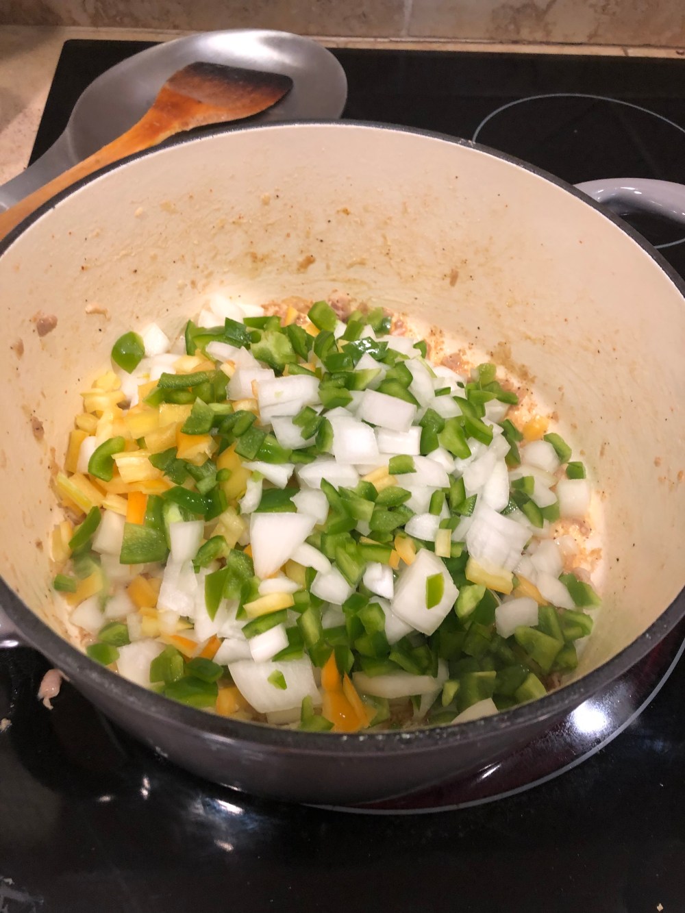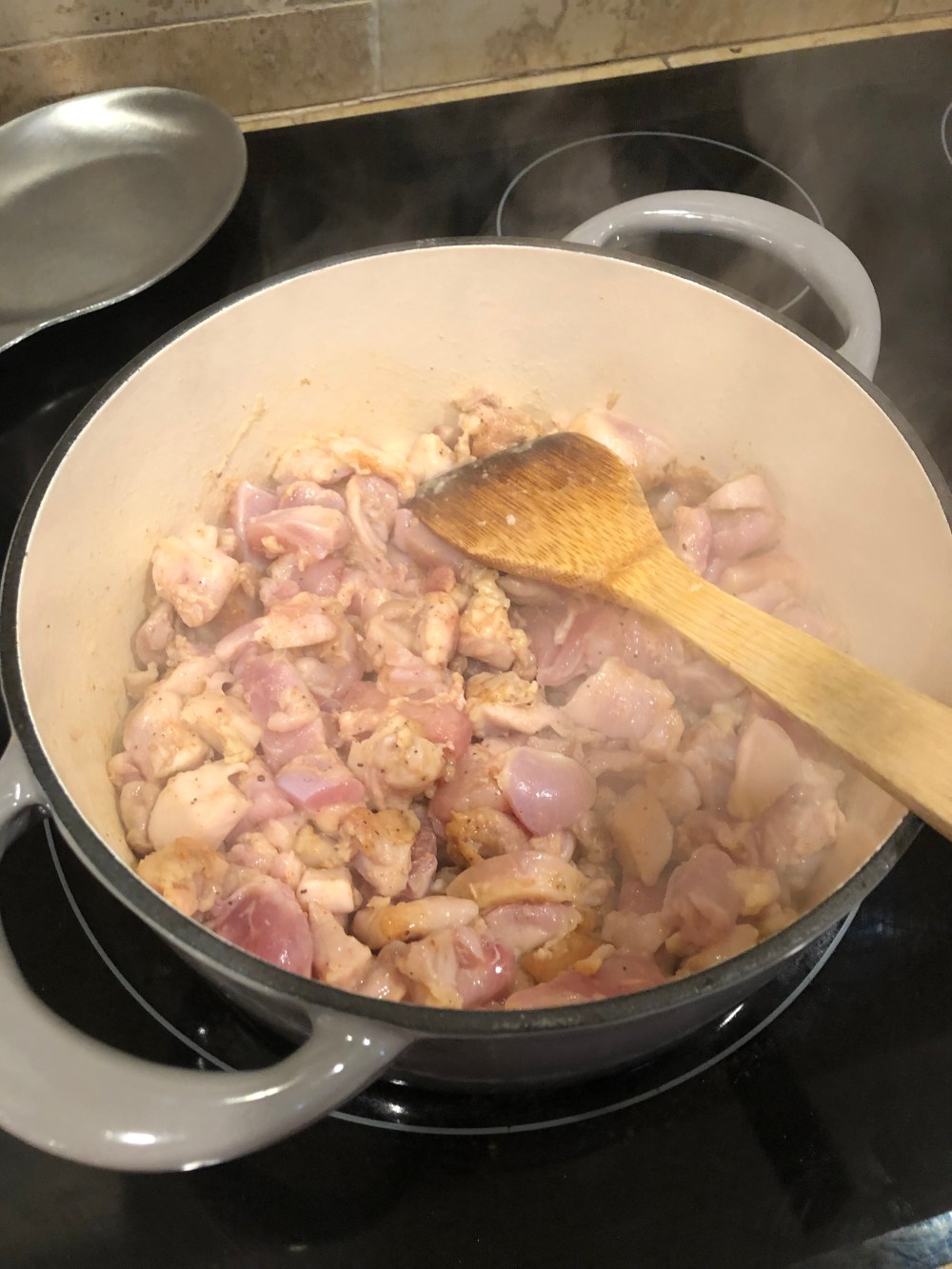 In my enameled cast-iron pot, I browned my chicken and removed once brown and half-cooked.