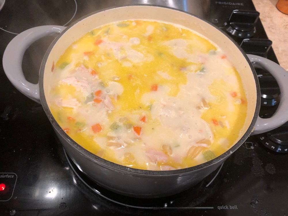 So to begin! I minced celery and onion and diced the carrot. Then, I chopped four pieces of bacon and began to fry that in my enamel cast iron pot. Once that was cooked, I added my vegetables to brown. When the onions became translucent, I added my pulled chicken meat. That cooked together for a couple of minutes and then I poured in my chicken stock. When that boiled, the dry macaroni is added. After 15 minutes, I put in the milk and cooked down until incorporated. To season, just use salt and black pepper… LOTS of black pepper.
